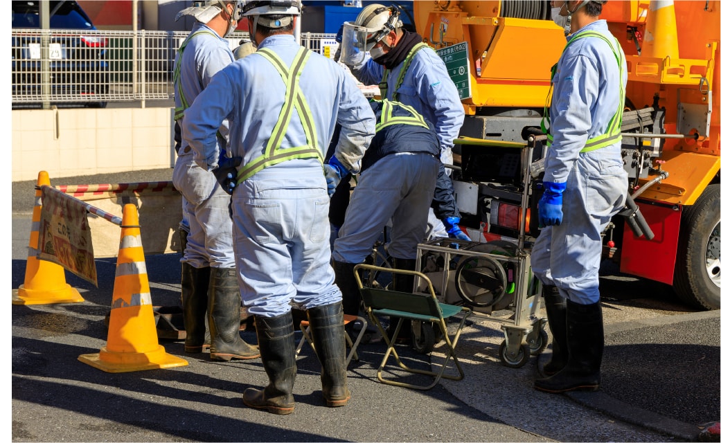 マンホール内の清掃などを行います。高圧洗浄機などを使用し、堆積土砂の除去・清掃/木の根・モルタル・油脂等の除去などを行います。
