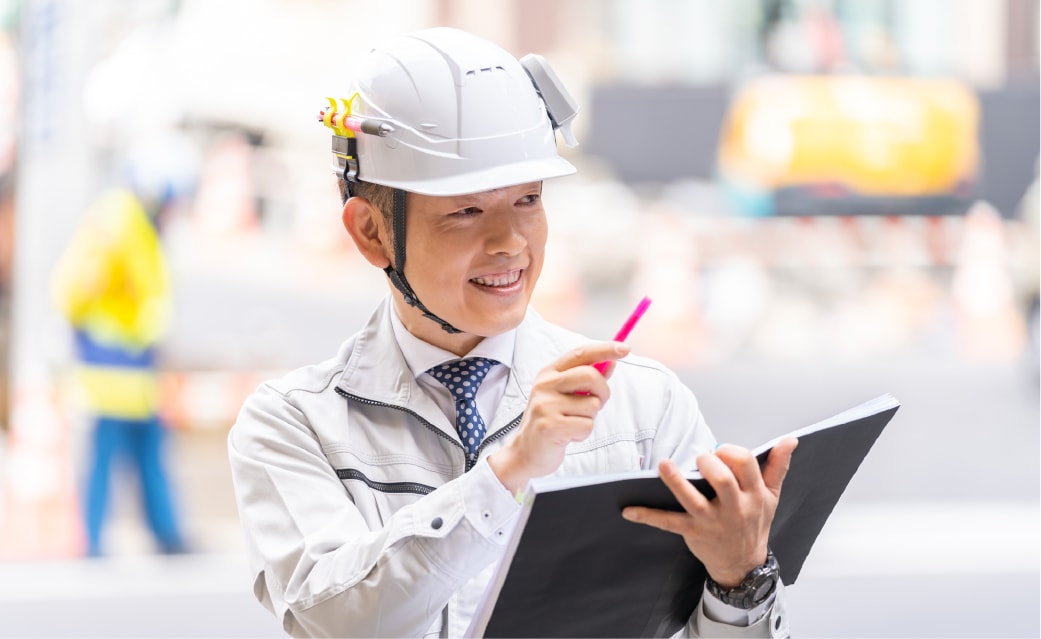 道路や橋などの工事現場で、工程・品質・安全・予算の管理を行う仕事です。設計図通りに工事が進むよう現場を指揮し、職人や関係業者と連携しながら完成まで導きます。